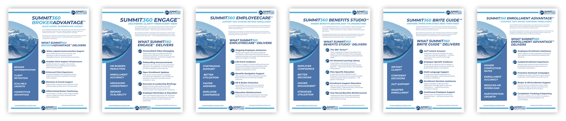 Summit360 isn't a single service dressed up with a few add-ons. It's a purpose-built suite of six trademarked offerings — each productized to solve a specific point in the benefits lifecycle, from broker enablement and enrollment to year-round employee support and AI-driven guidance. For brokers, that means a real shelf of named, defined tools you can bring to every client meeting — not a vague promise of "communication help."